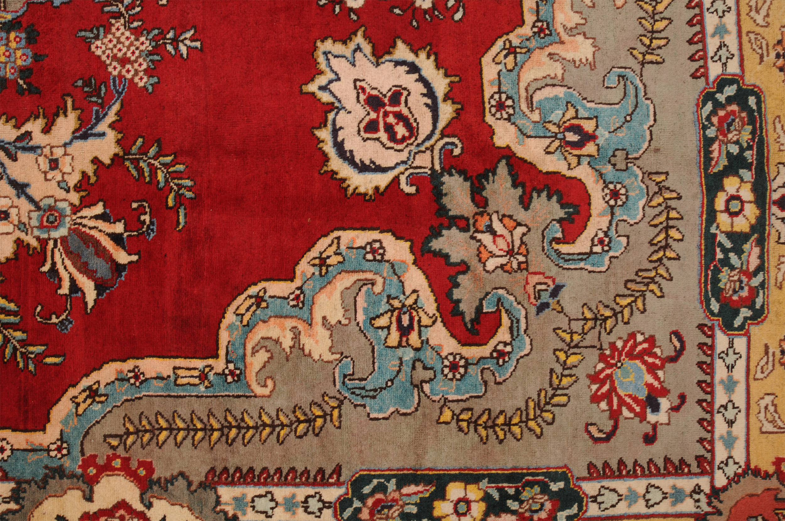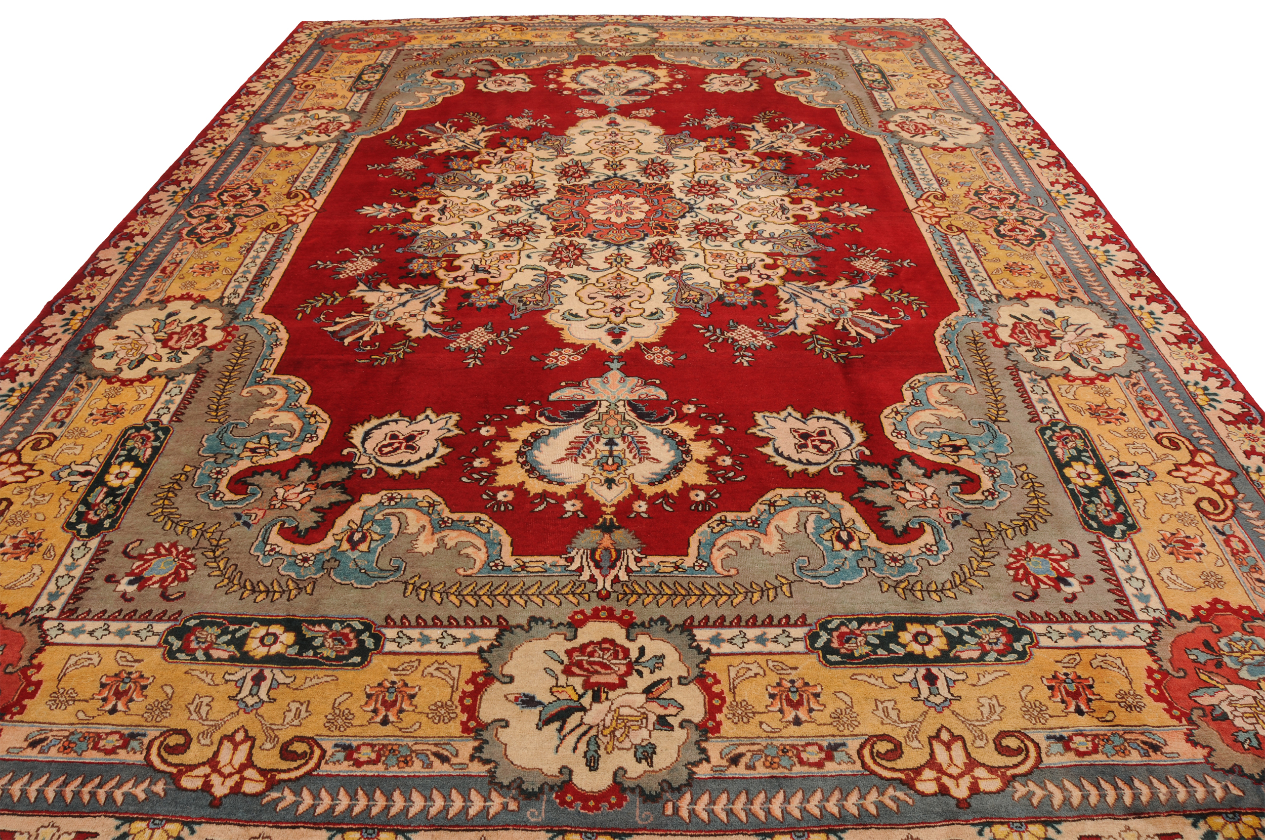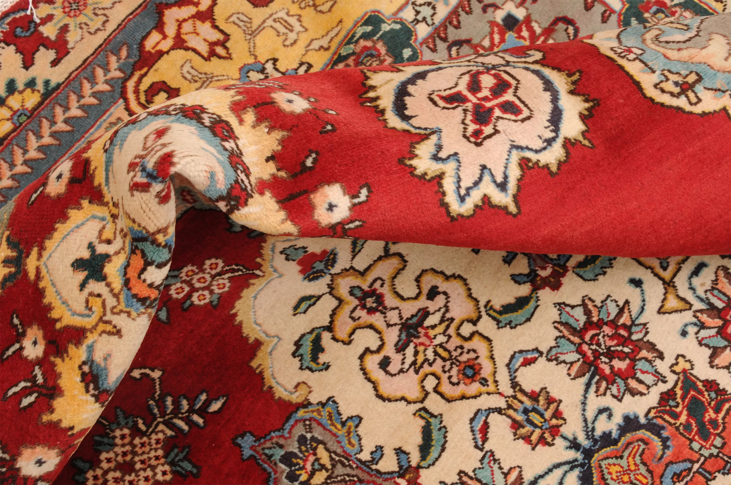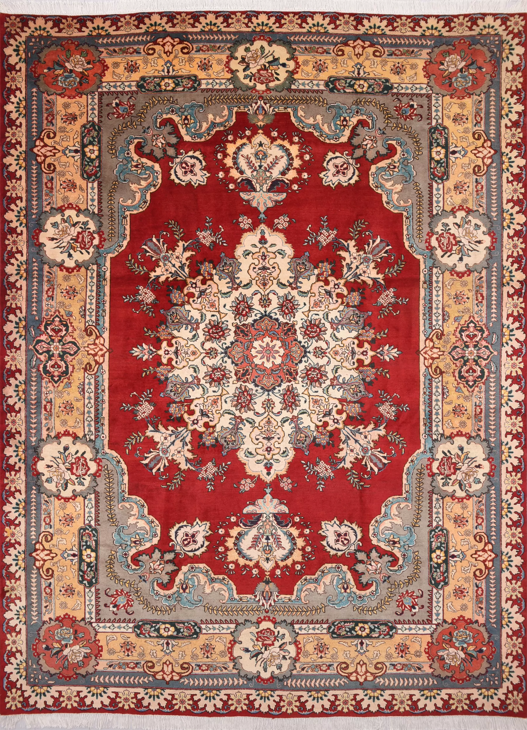 This  Tabriz Persian rug features a beautiful  Medallion design in Red, yellow, Orange, and Beige. It is made of 100% wool and has a medium pile height of 1/3″-3/8″ and a knot density of approximately 156 KPSI. Perfect for dining and living room.