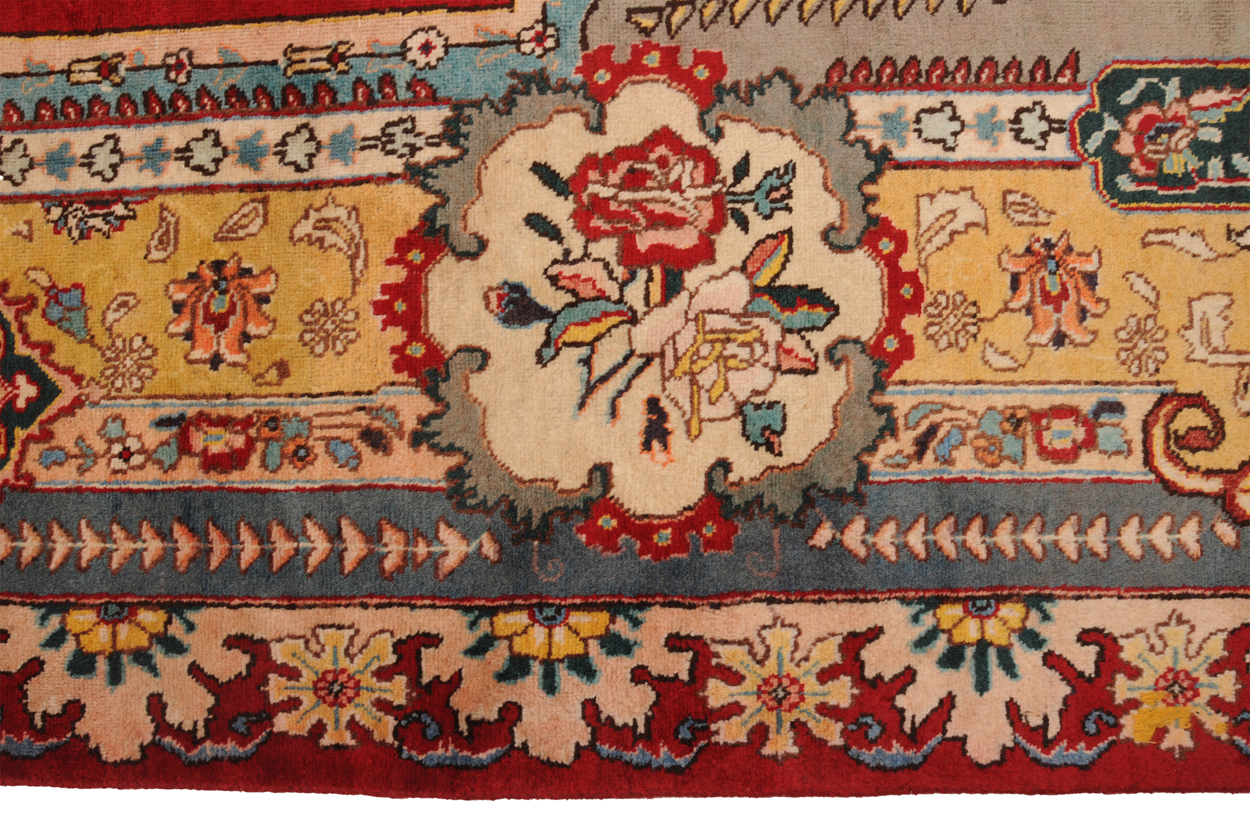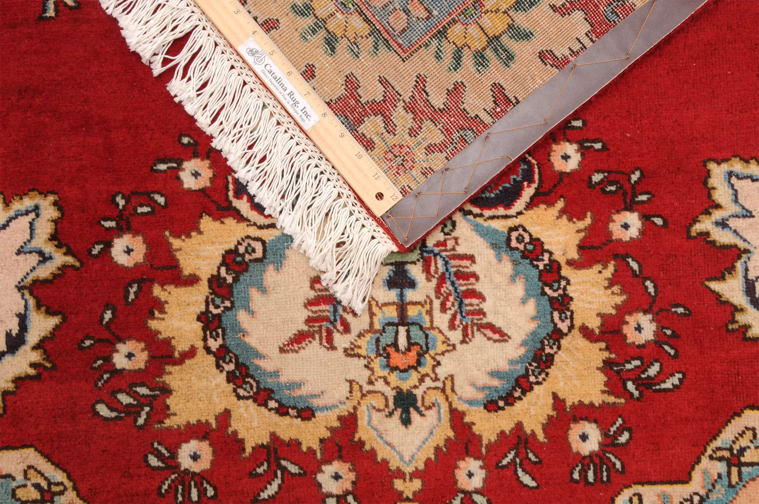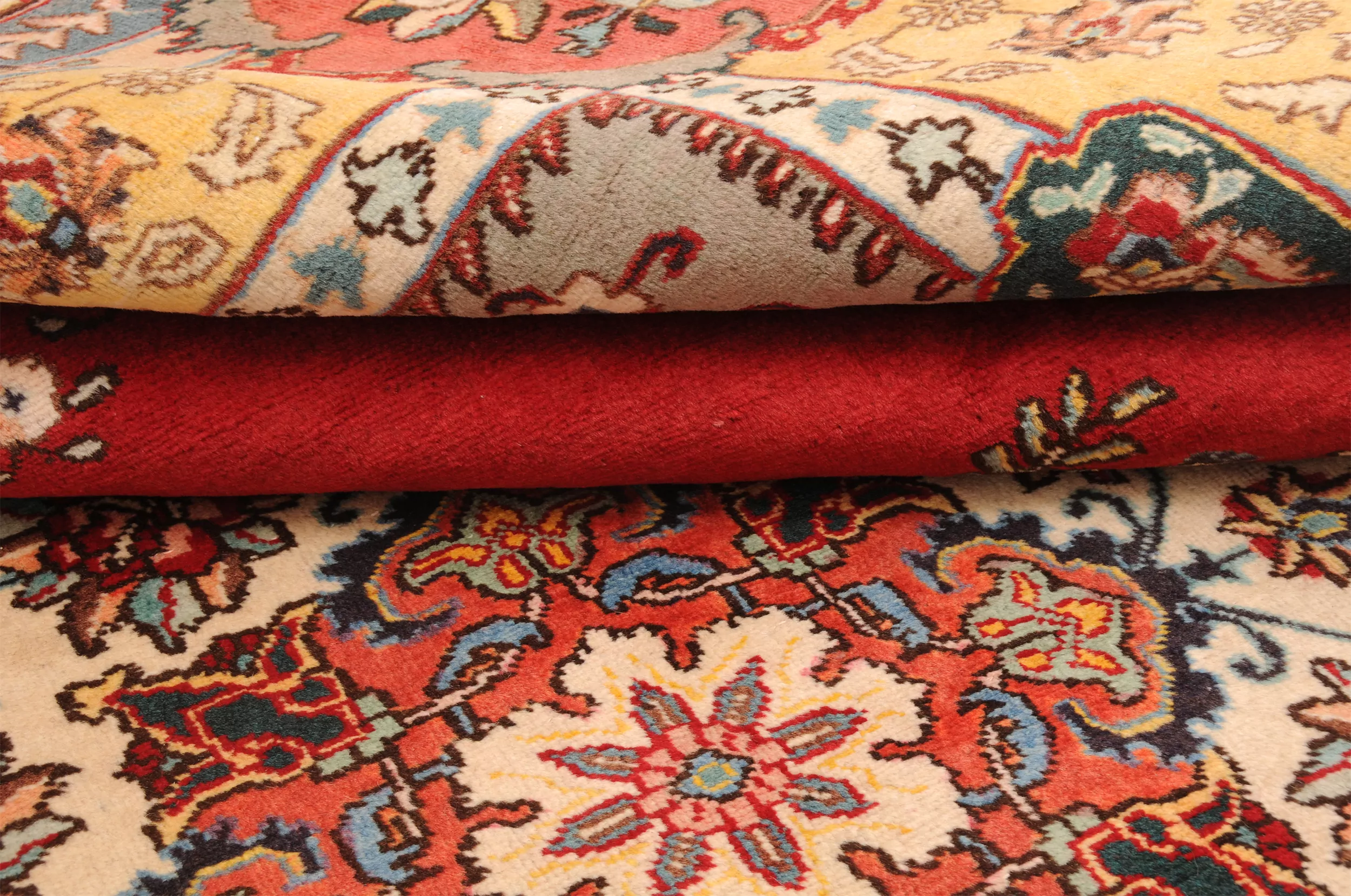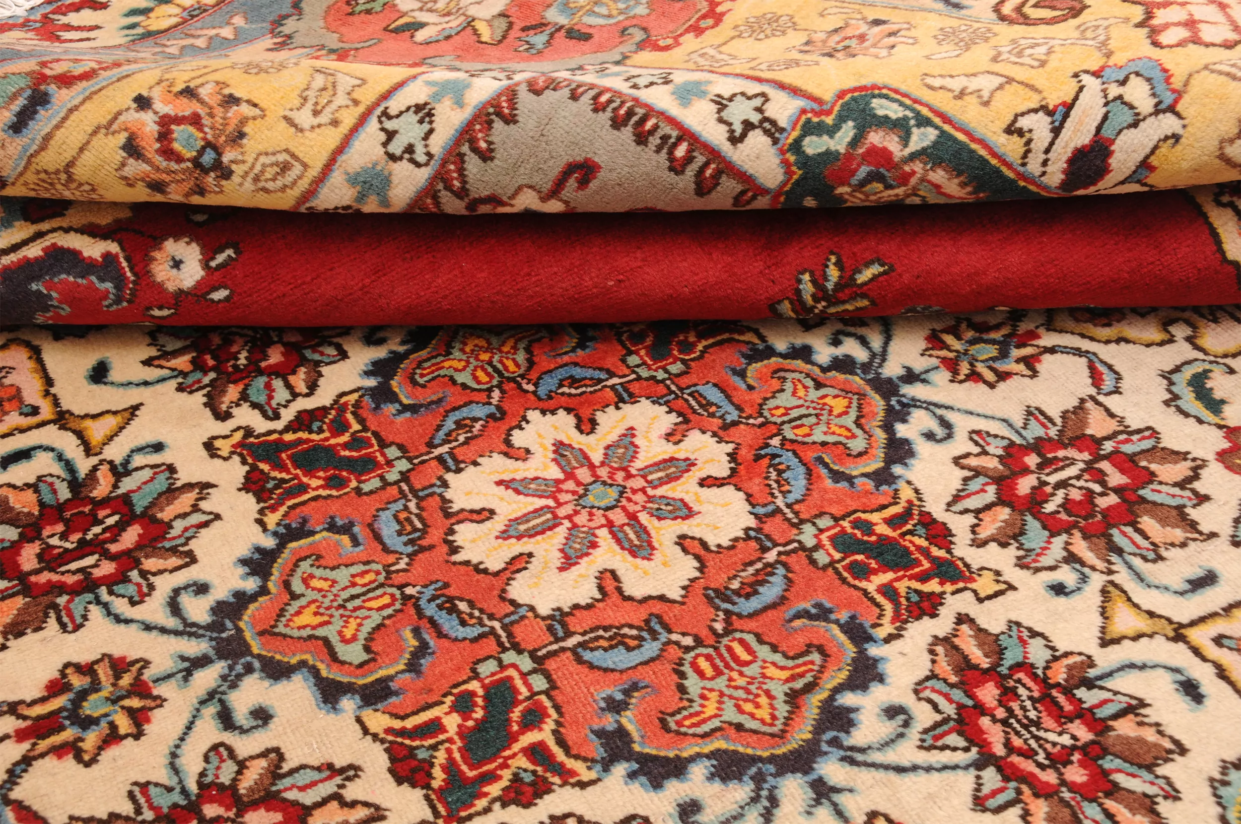 This  Tabriz Persian rug features a beautiful  Medallion design in Red, yellow, Orange, and Beige. It is made of 100% wool and has a medium pile height of 1/3″-3/8″ and a knot density of approximately 156 KPSI. Perfect for dining and living room.