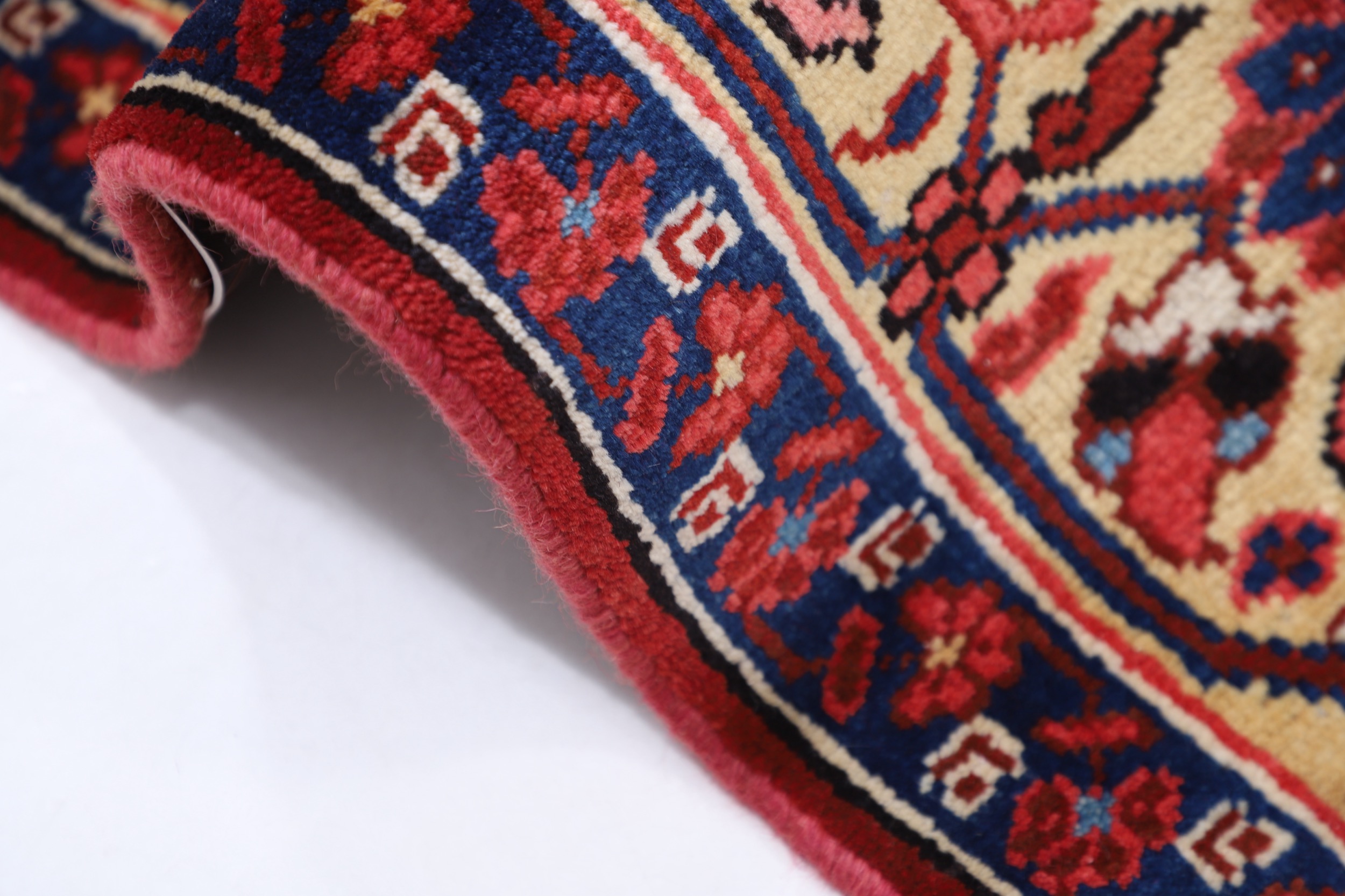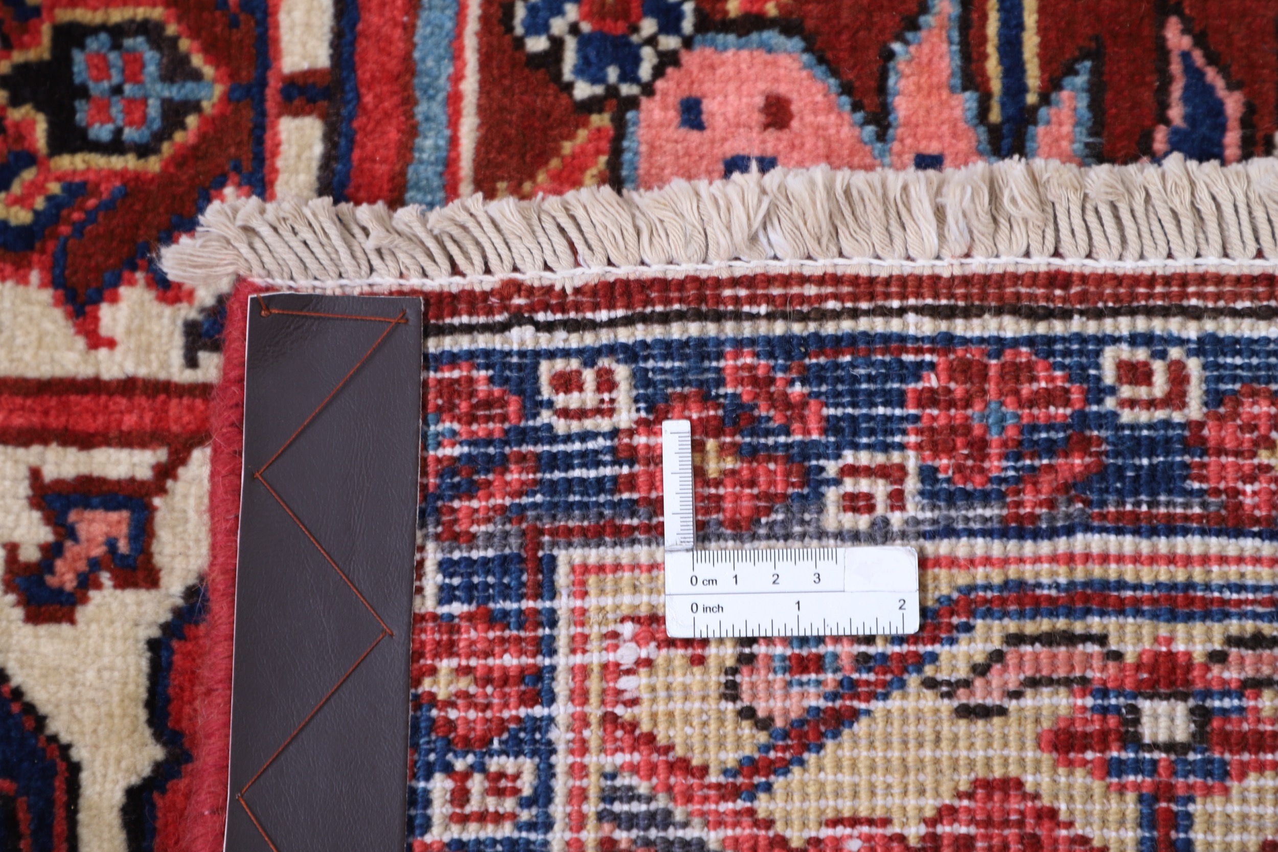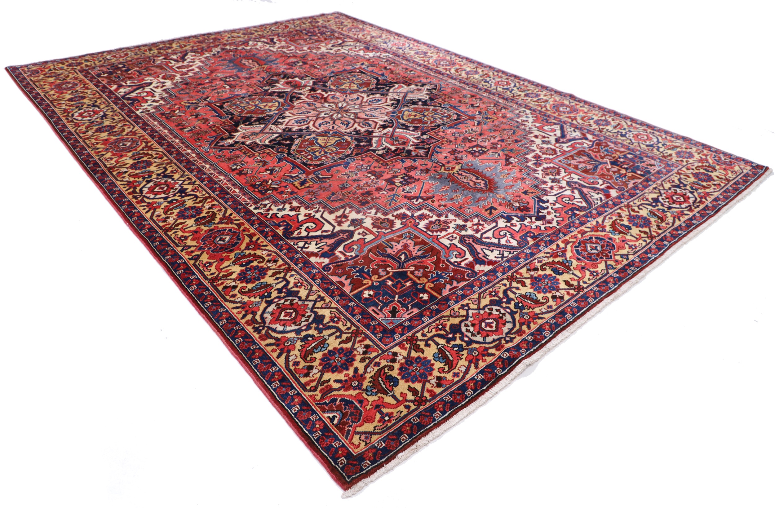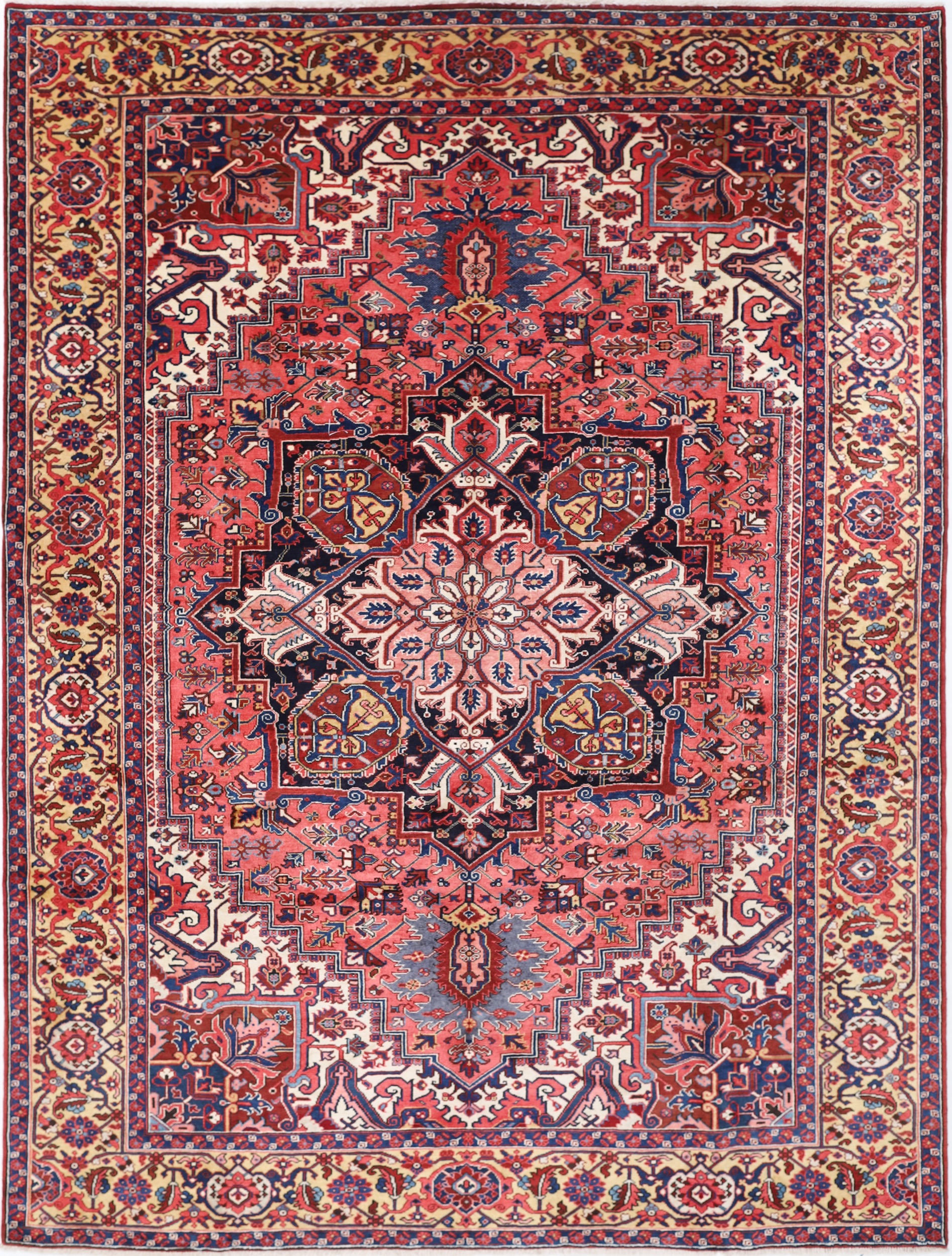 Handcrafted with precision and artistry, this Persian rug showcases the timeless beauty of a Hand Knotted Heriz design. Measuring 9’8″ x 13’2″, this rare piece holds a special charm as it has gracefully aged for 60-70 years, adding a sense of history and character. The stunning combination of blue and yellow geometrical patterns adds a vibrant touch to any space. With approximately 156 knots per square inch, this rug guarantees exceptional quality and durability. Made from 100% wool with a high pile ranging from 1/2″ to 5/8″, this cotton-based masterpiece offers both comfort and style.