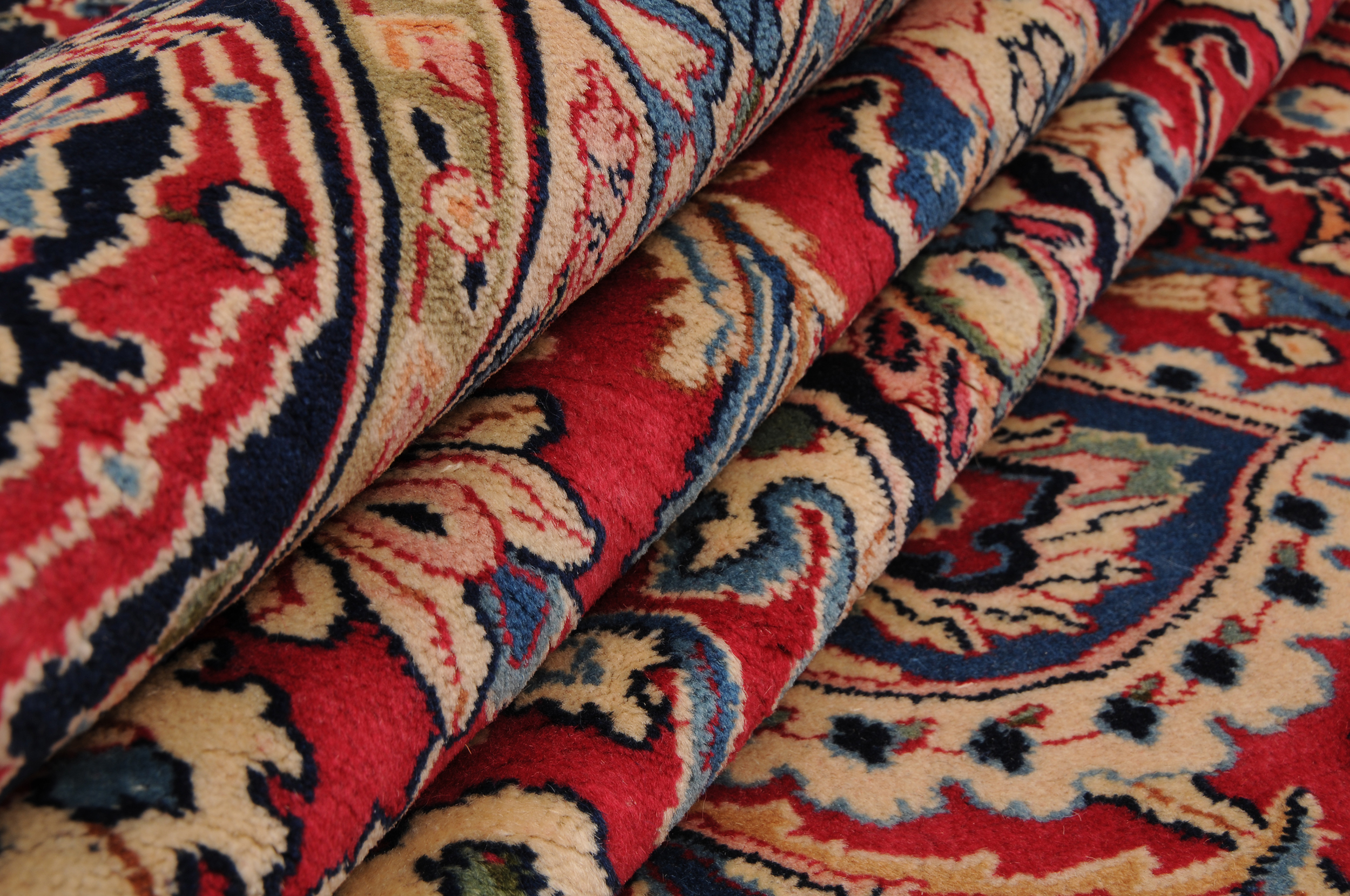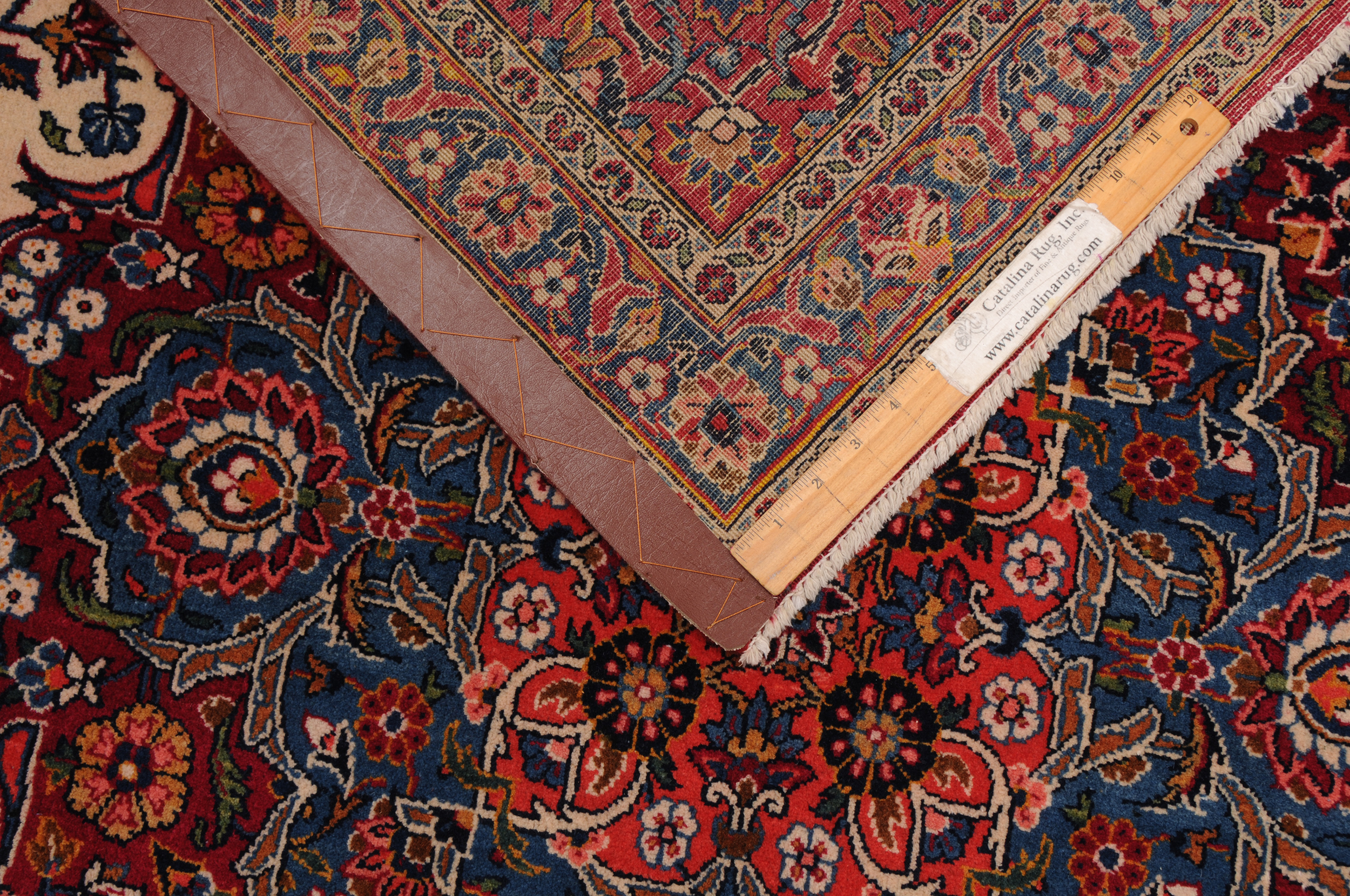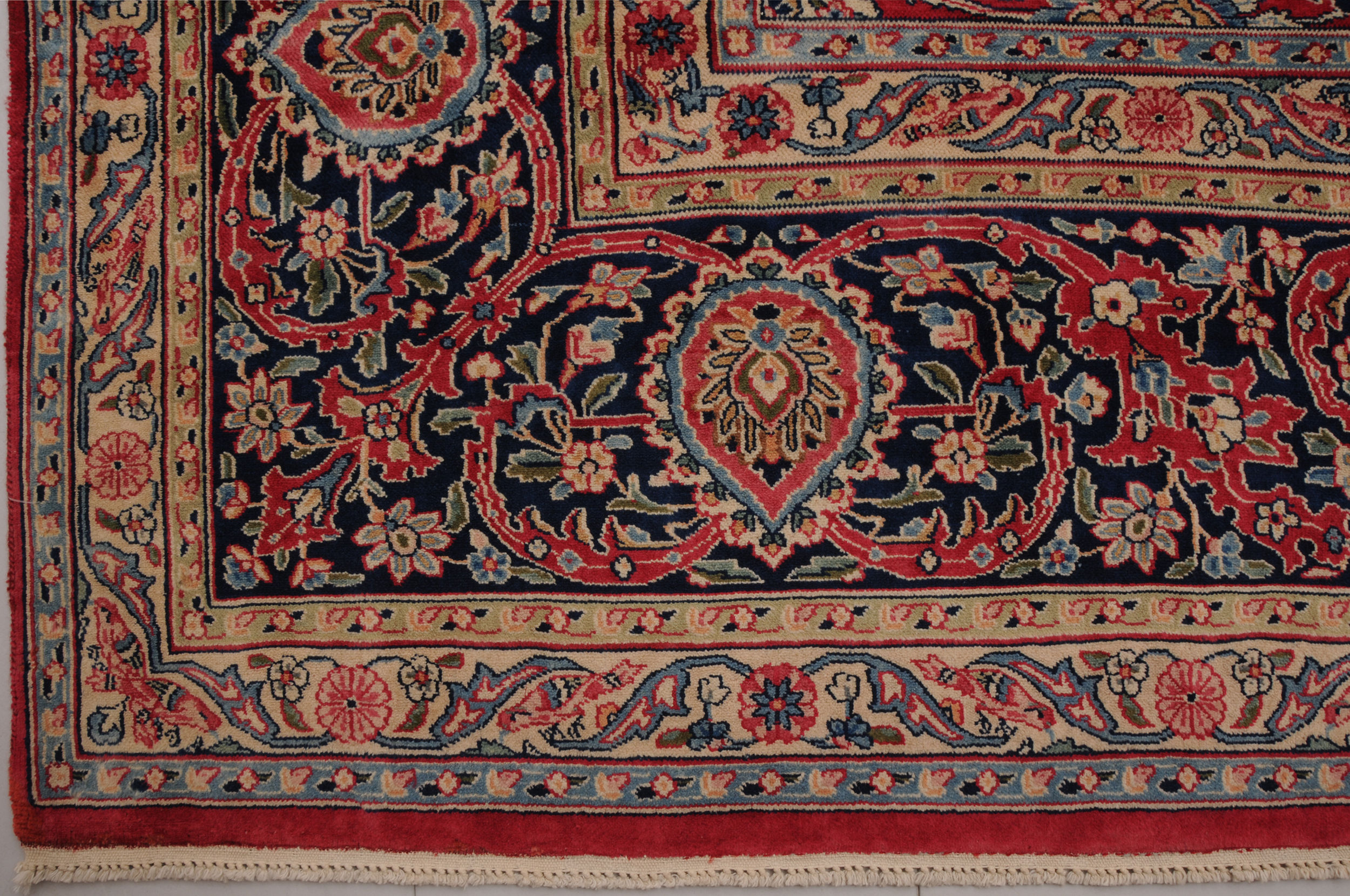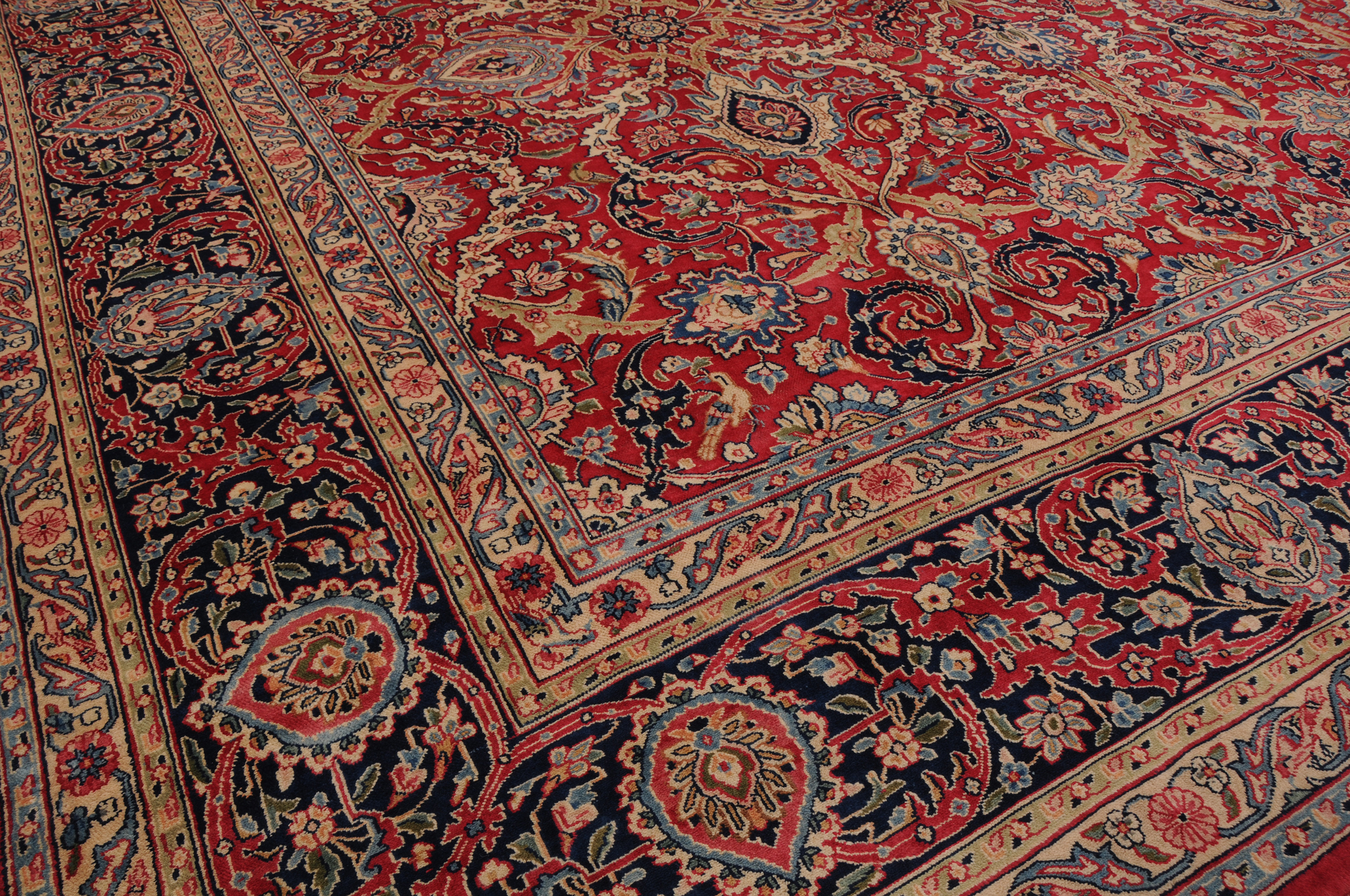 This 9’8″ x 13’3″ Kerman rug, hand-knotted in Persian, features a medallion design. It is woven with Approx.289 KPS, showcasing a field in Red and a Blue border. The rug has a Medium Pile and a 100% Wool pile, and is in excellent condition.