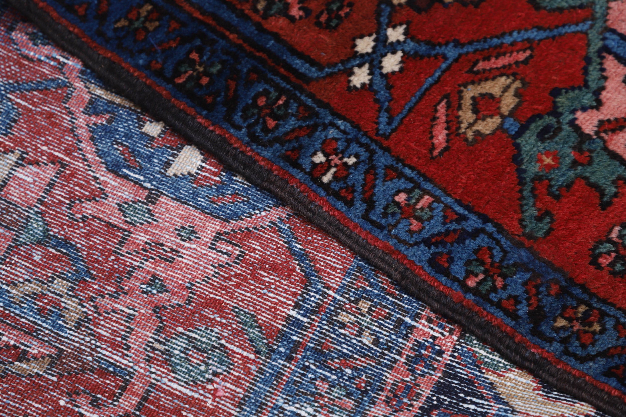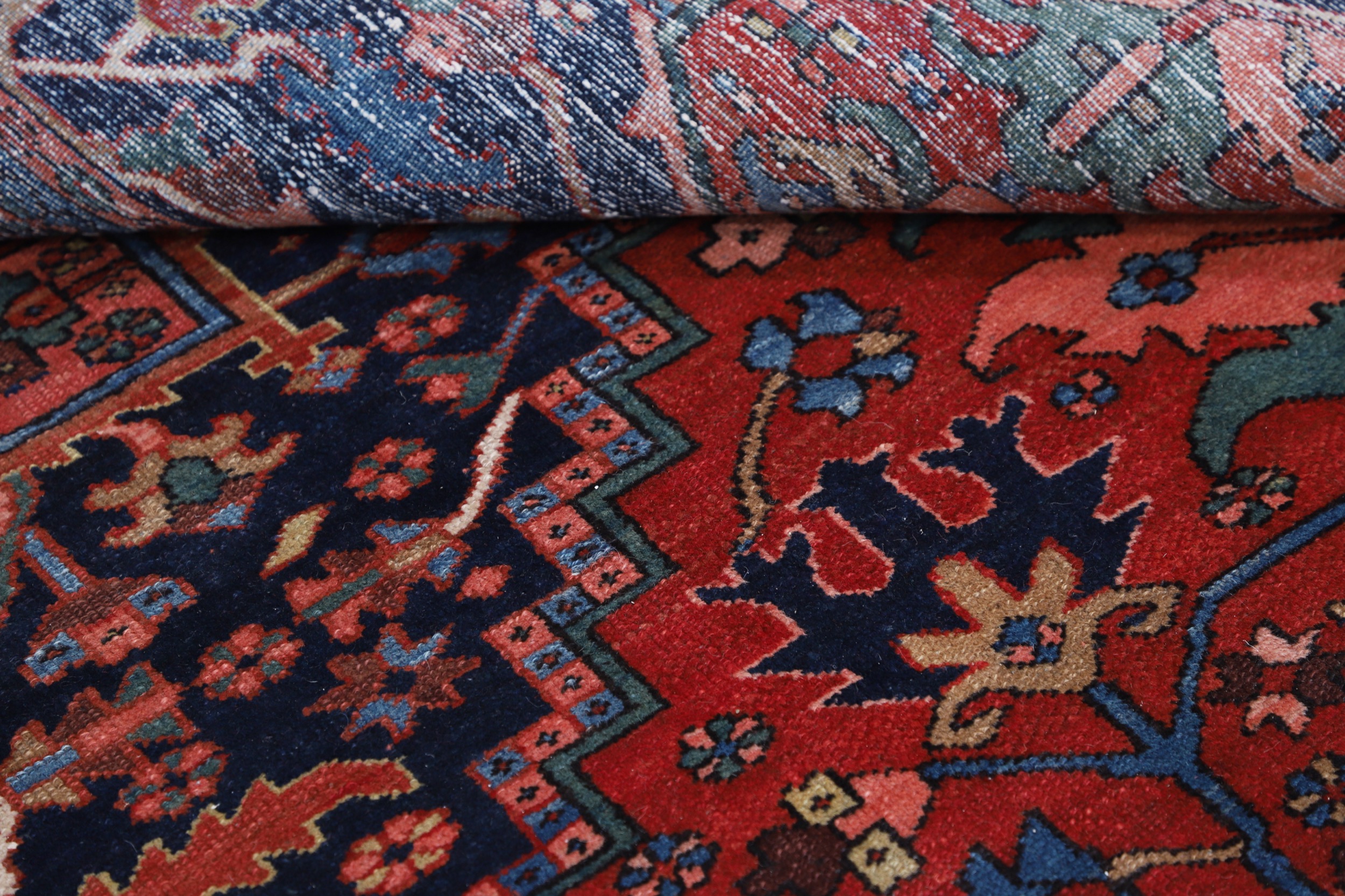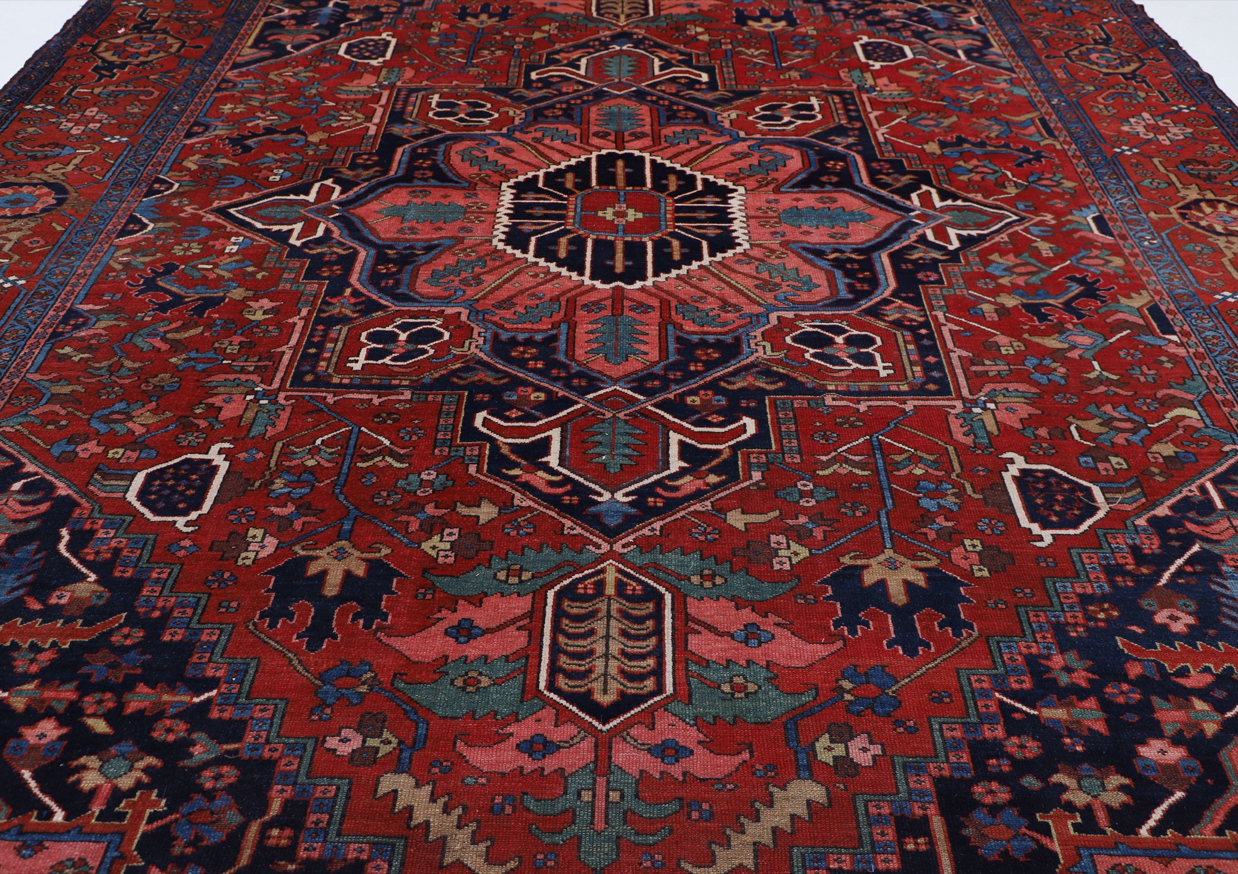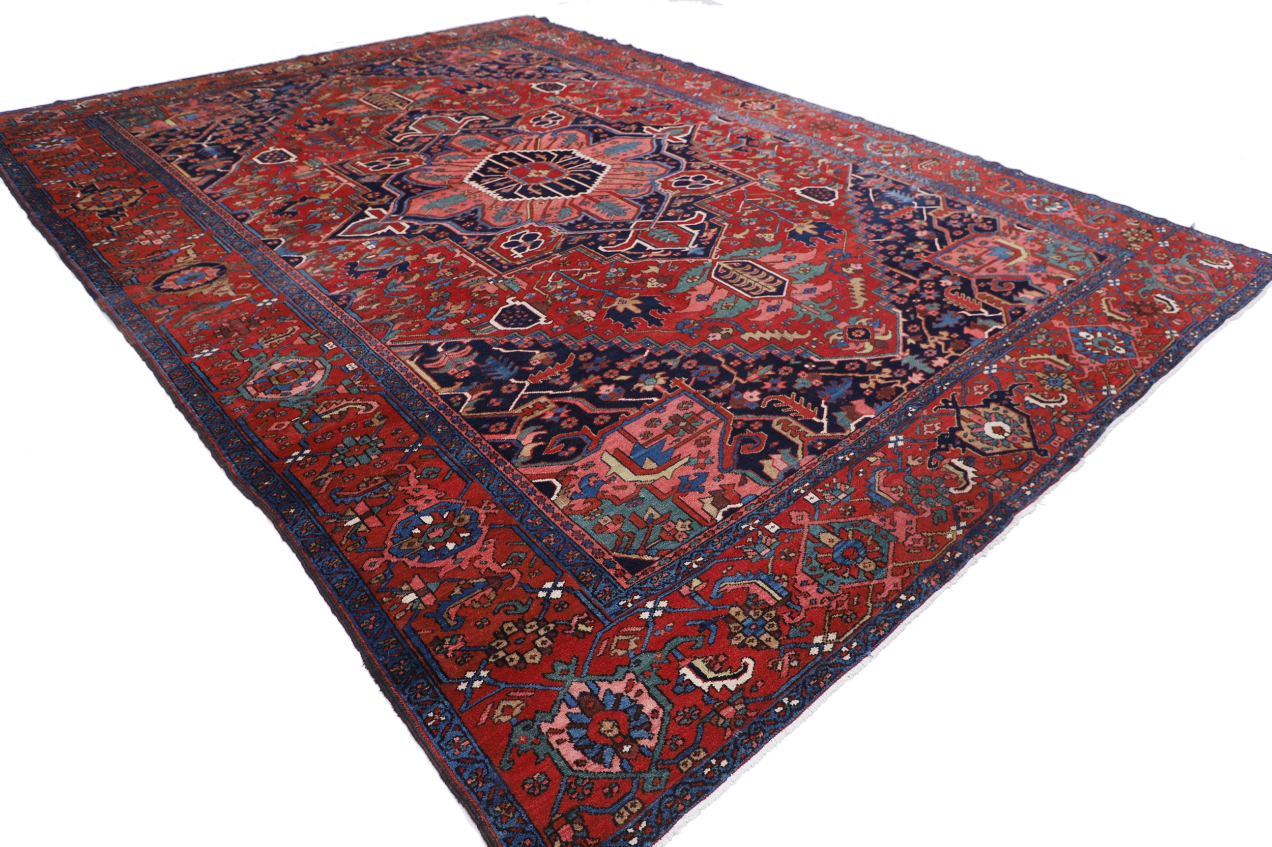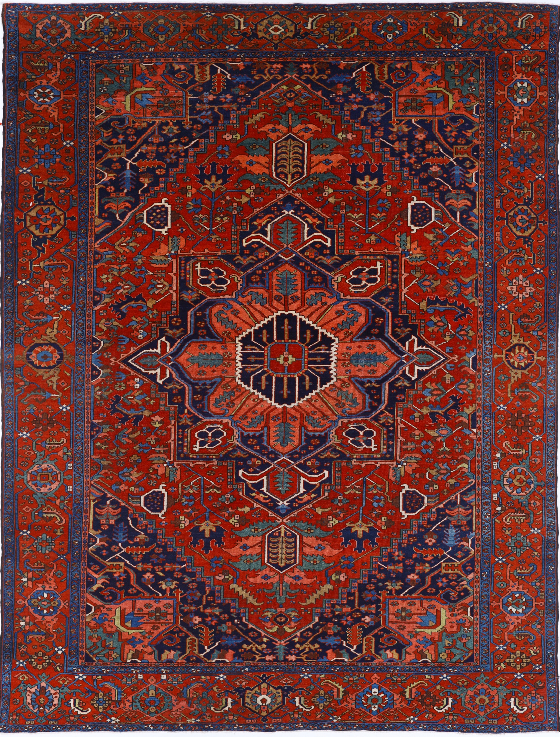 This Persian Antique Heriz rug is stunning with blue color and Red geometric design. Made from 100% wool with a high pile of 1/2″-5/8″ and a knot density of approximately 144KPSI, it is both luxurious and durable. The dimensions of 11’1″ x 15’2″.