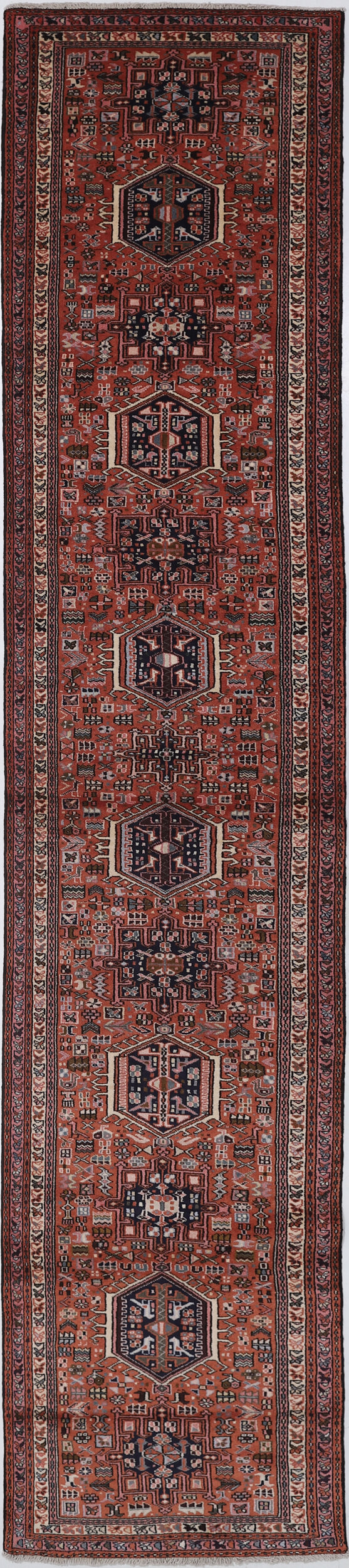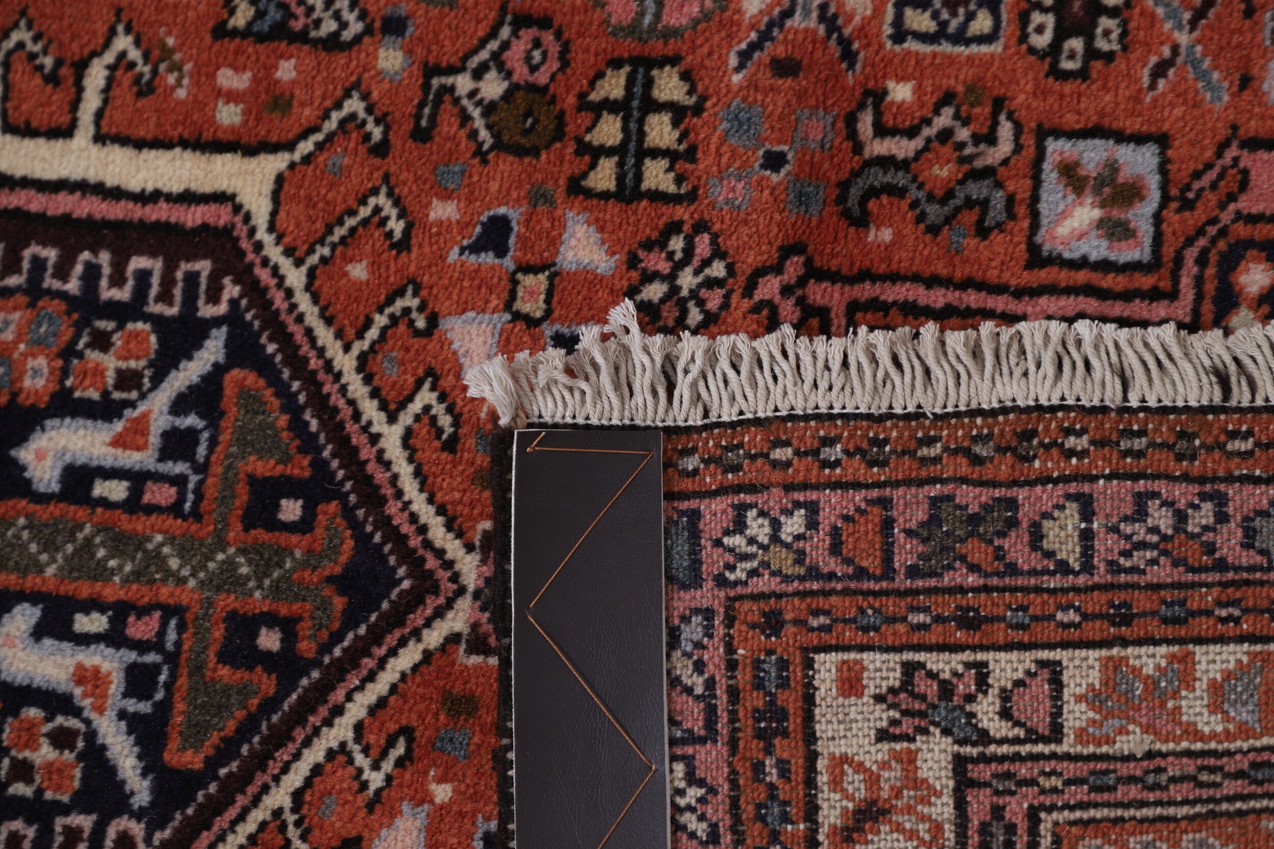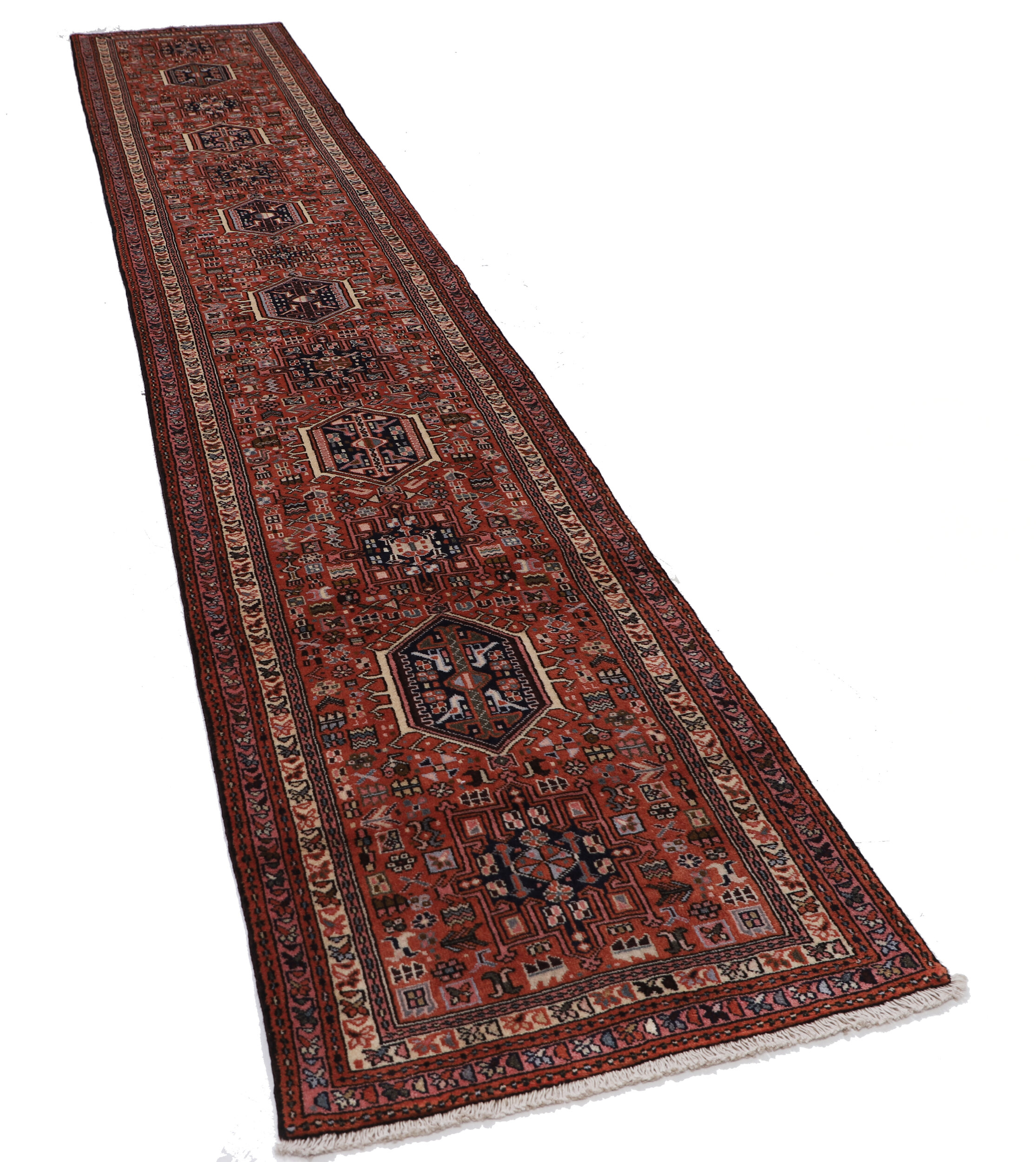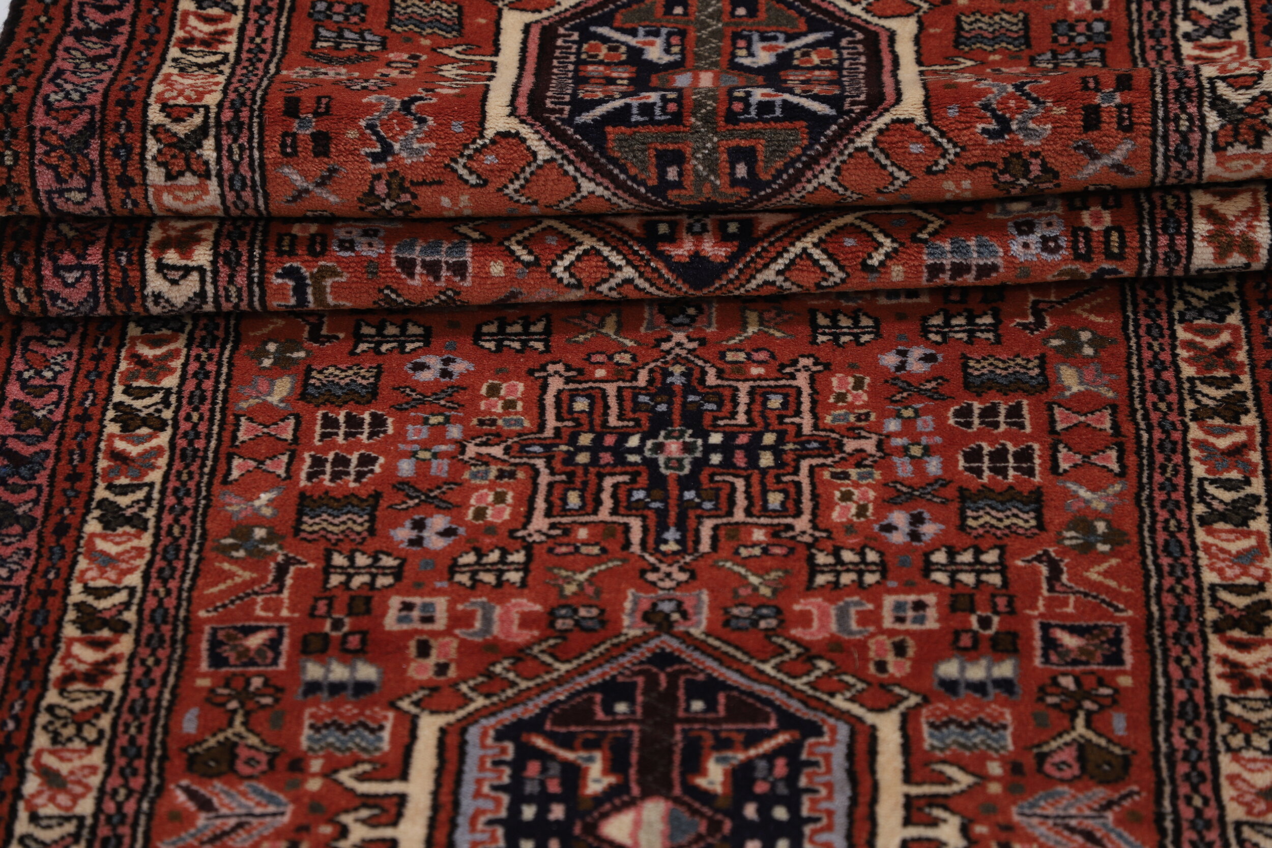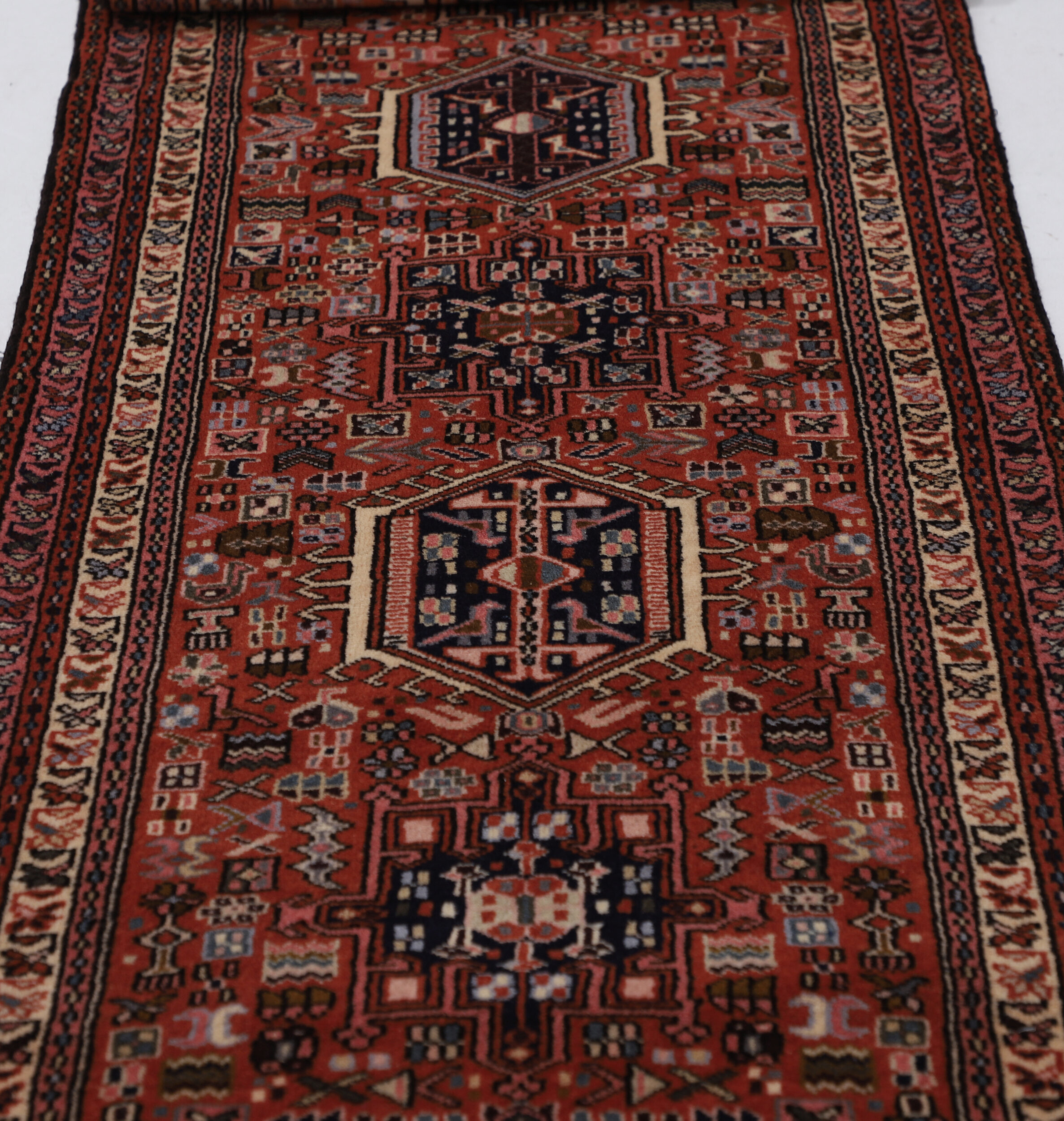 This Persian rug is a stunning addition to any room and hallway. With its aged Rust color and geometric design in beige, Red, and brown, it adds a touch of elegance. Made from 100% wool with a high pile of 1/2″-5/8″ and a knot density of approximately 196 KPSI, it is both luxurious and durable. The dimensions of 2’8″ x 15’2″‘ make it perfect for a hallway