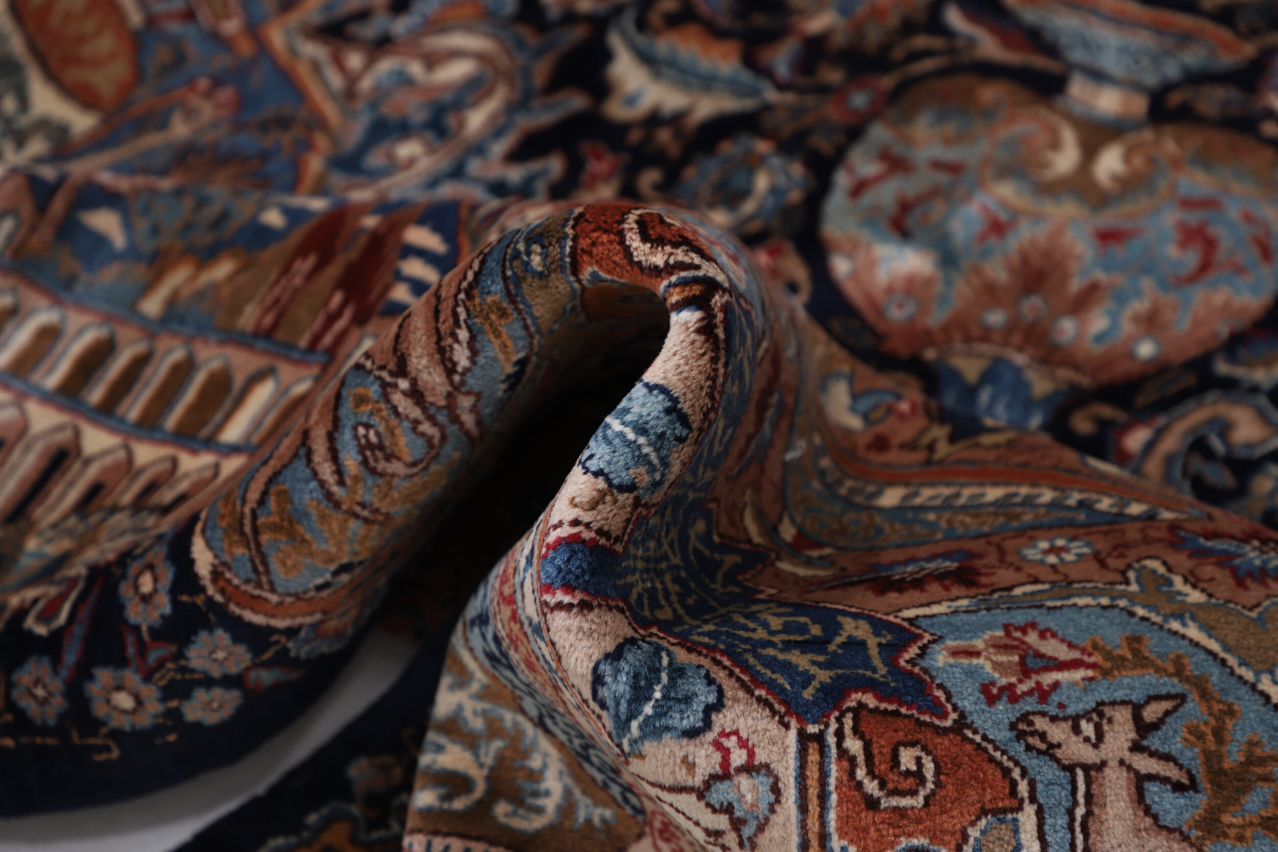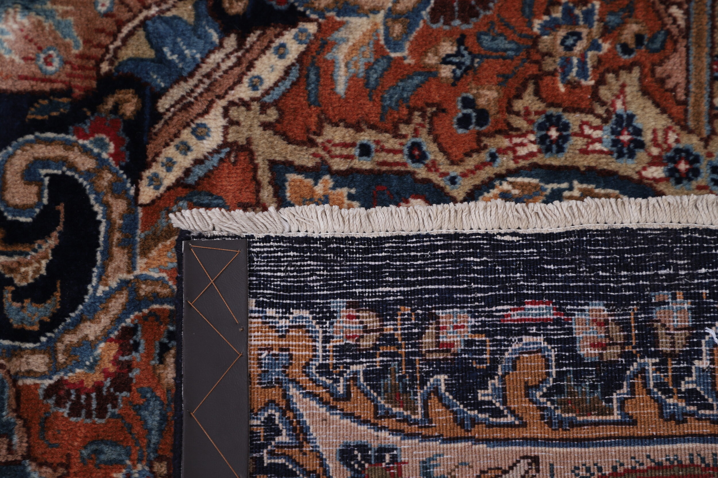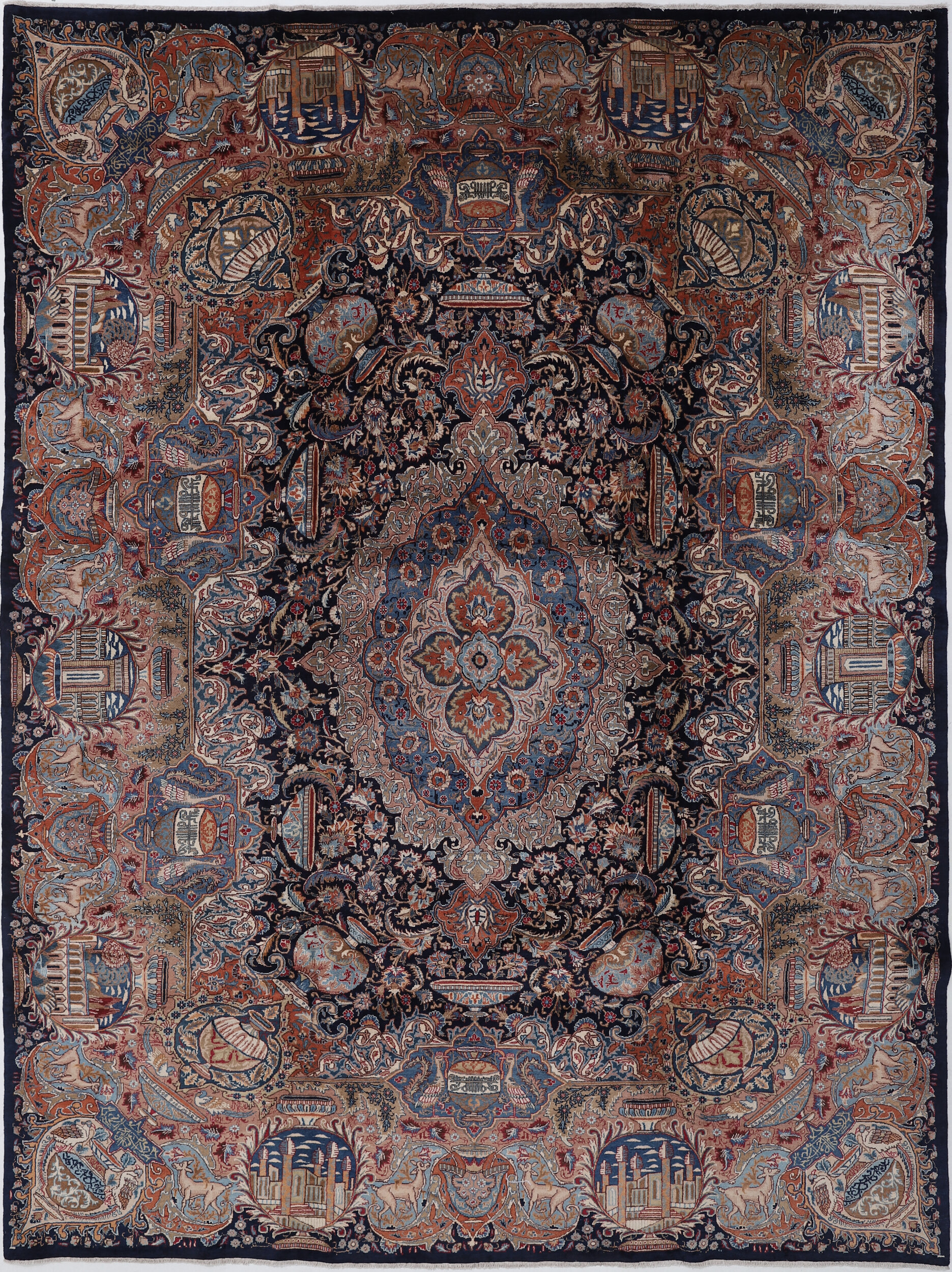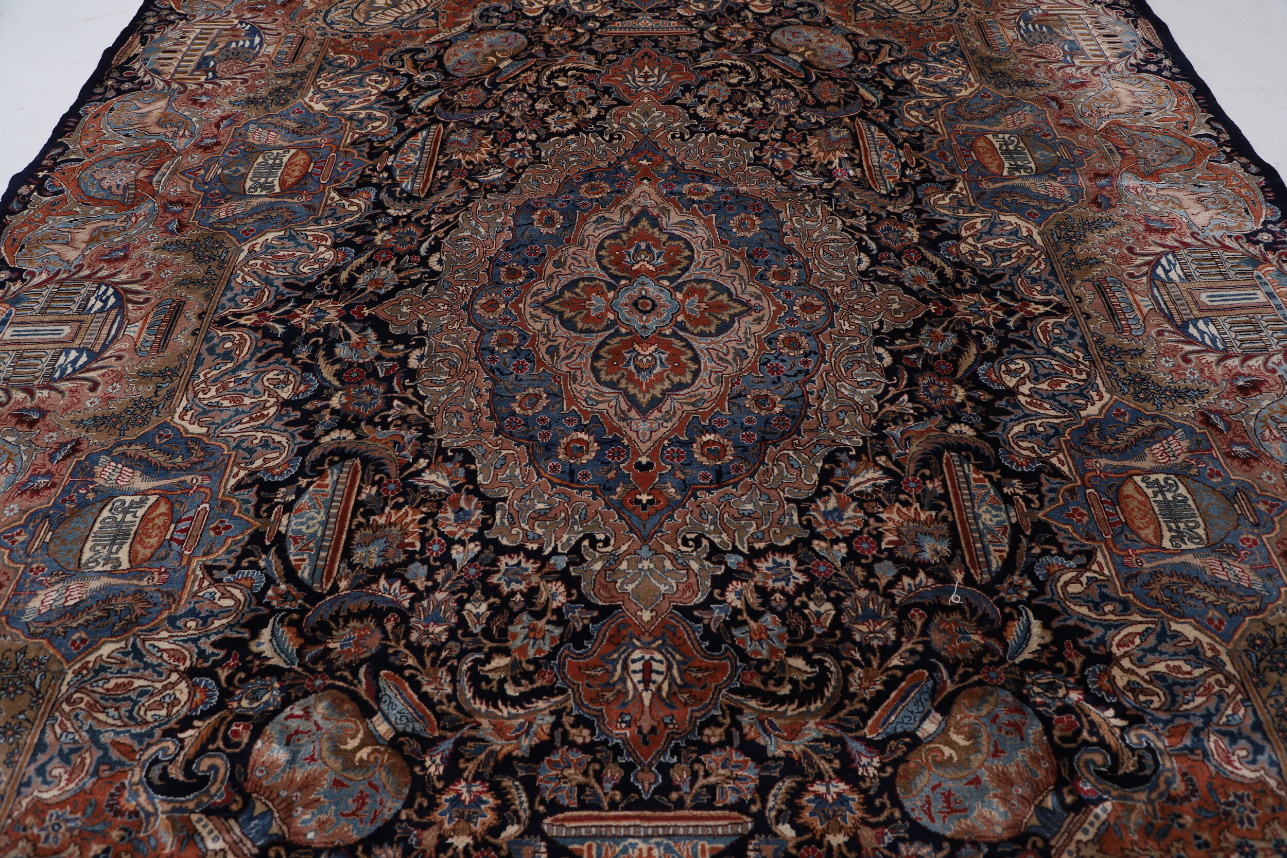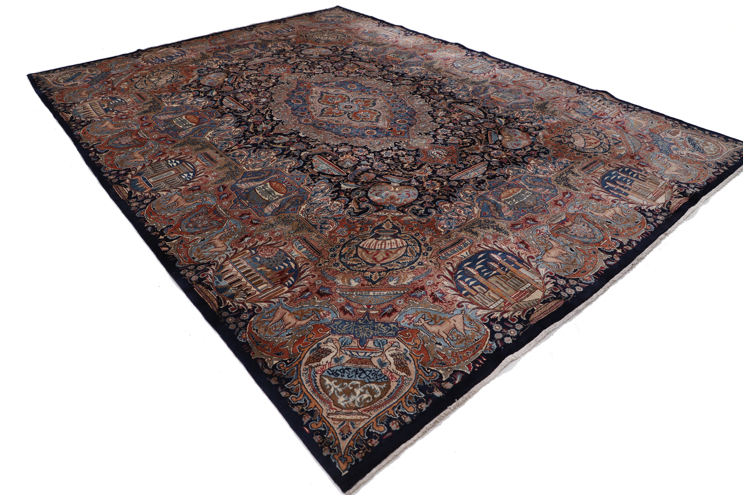 This Persian Kashmar rug, measuring 9’8″ x 12’10”, features a high pile of 1/2″-5/8″ made from 100% wool. With an aged appearance and a beautiful combination of beige, brown, orange, burgundy, and blue colors, this rug adds a touch of elegance to any space. The intricate design and knot density of approximately 196 KPSI make it a true work of art.