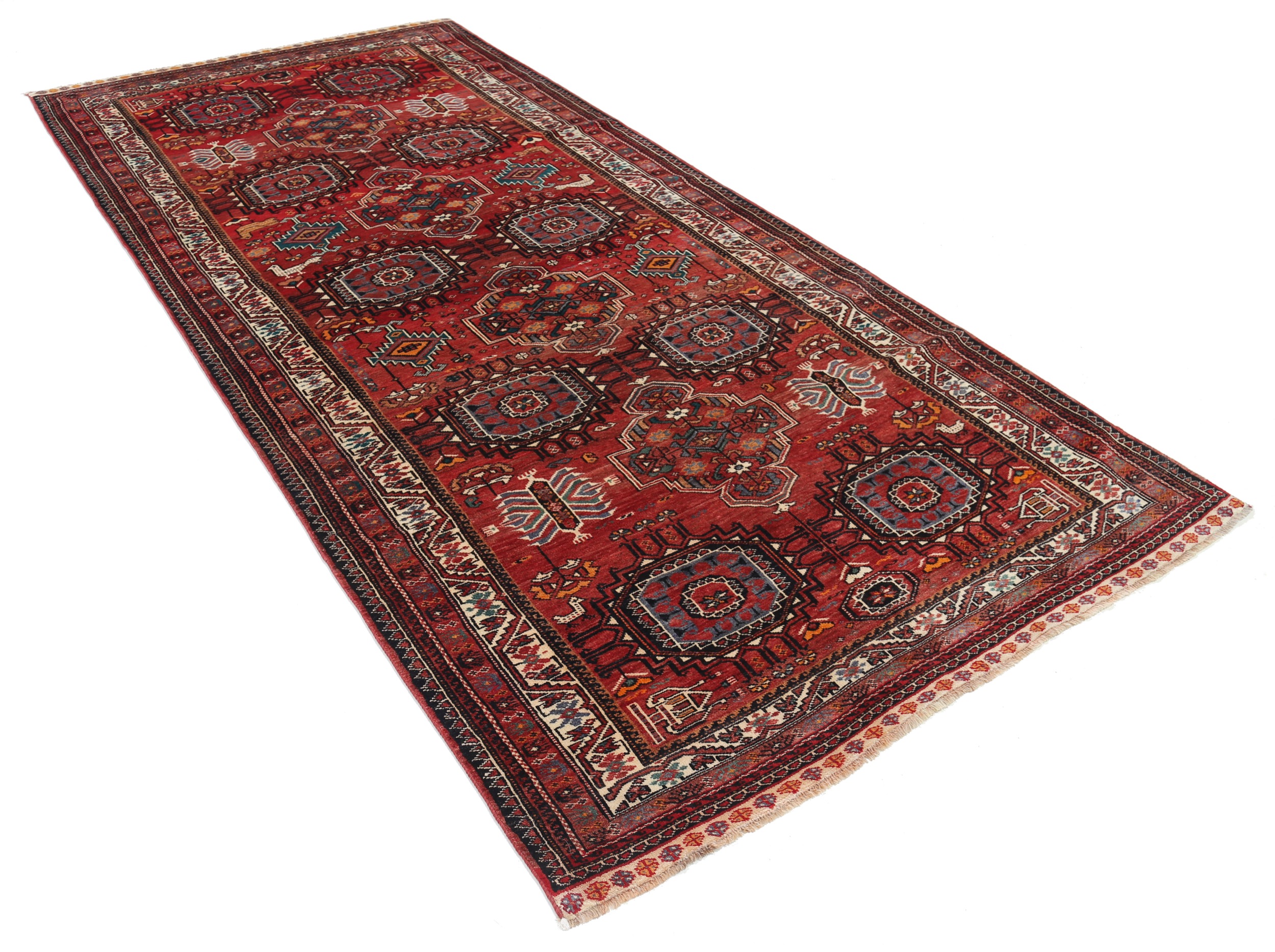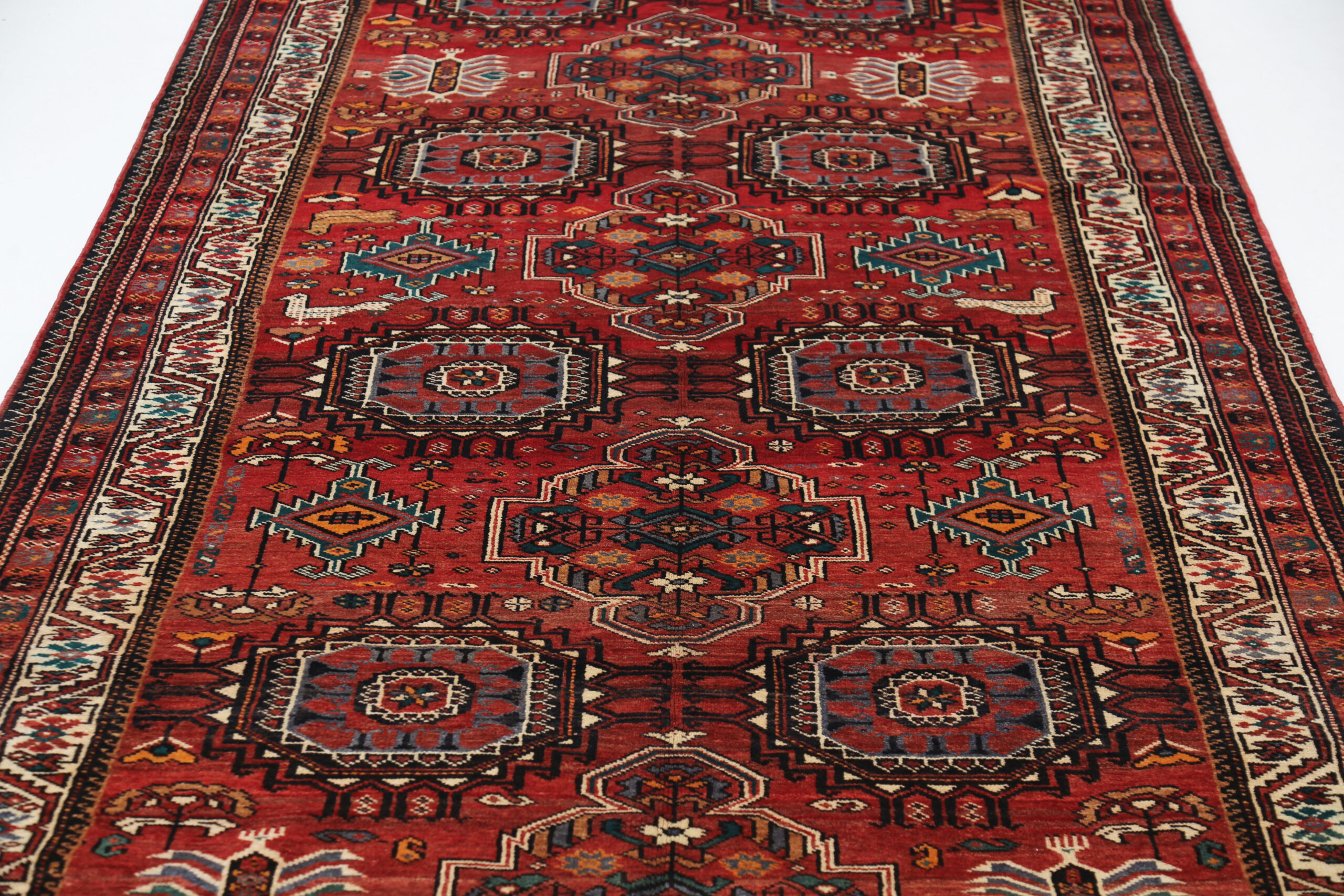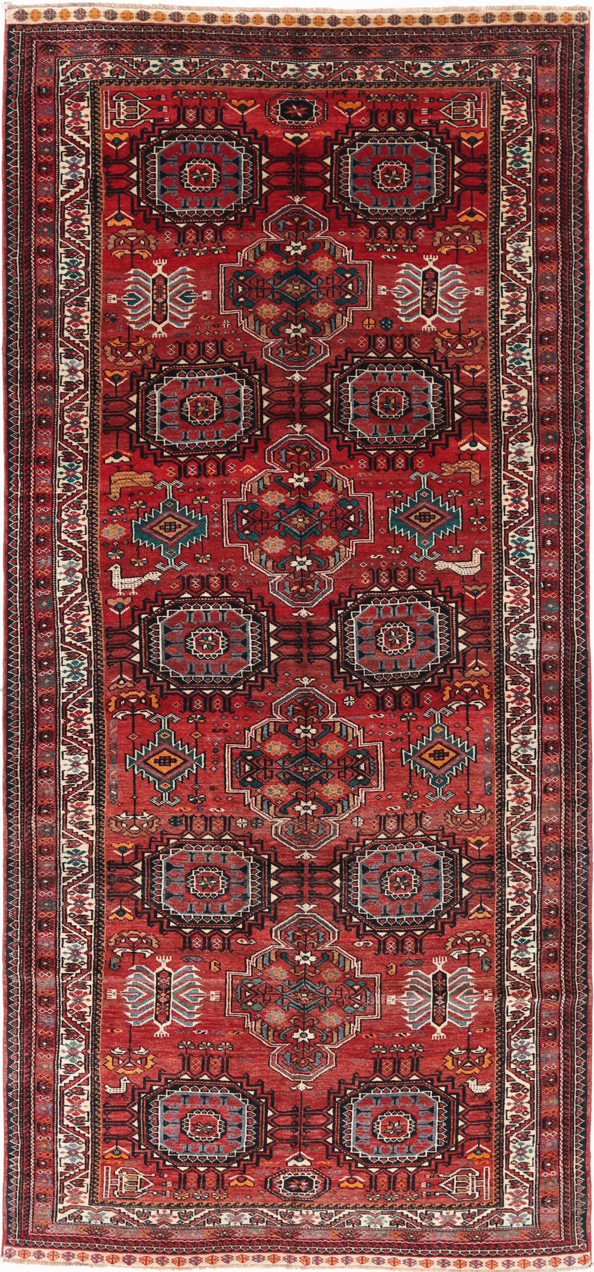 This Quchan Kurdi Persian rug, measuring 5′ x 10’7″, features a beautiful combination of beige, brown, blue, and green colors. Made from 100% wool with a medium pile height of 1/3″-3/8″, it showcases an aged design and has an approximate knot density of 196 KPSI.