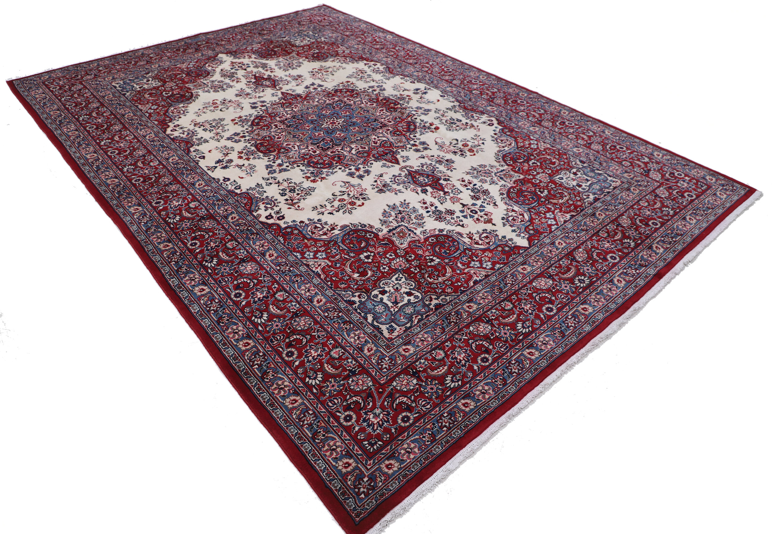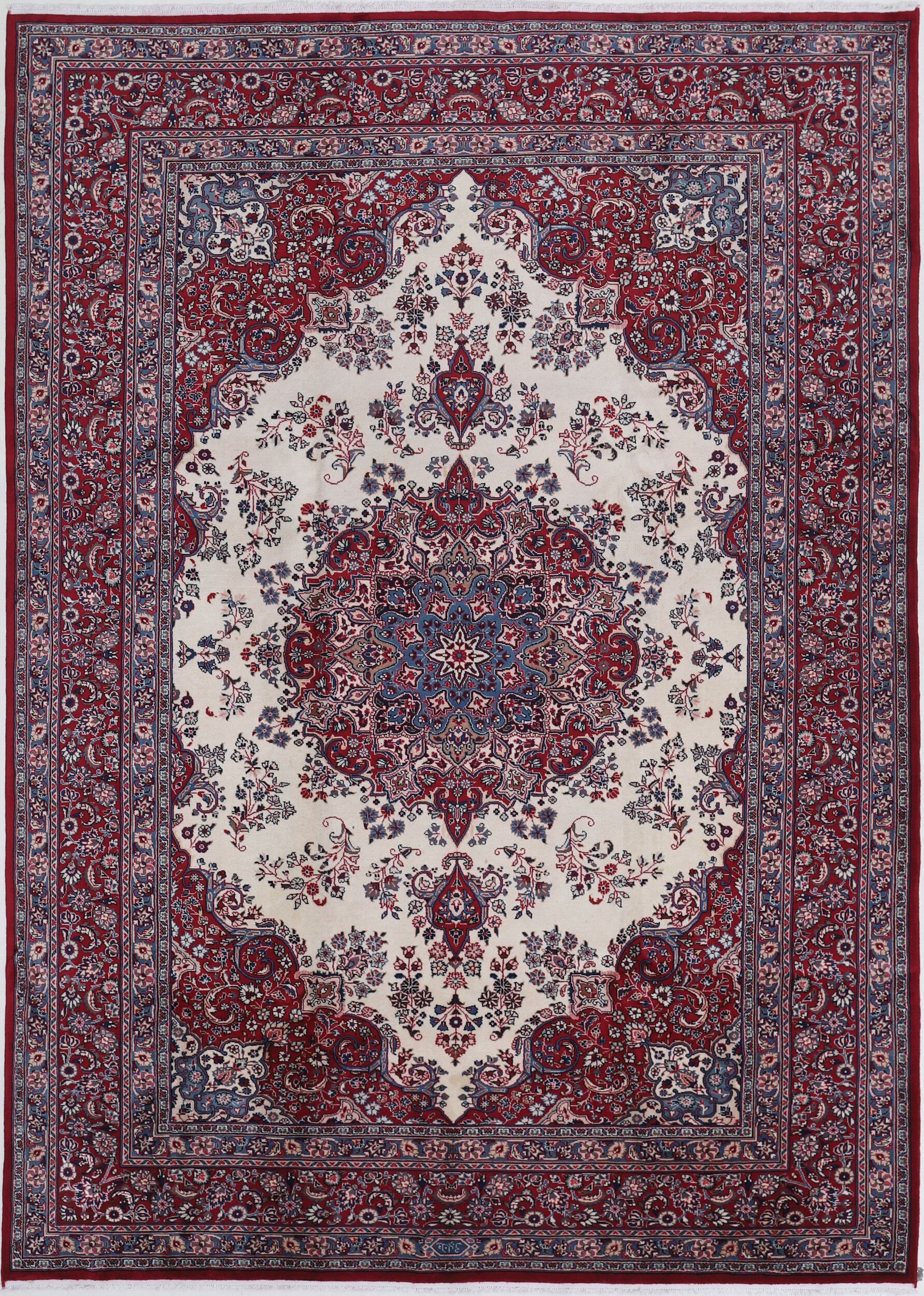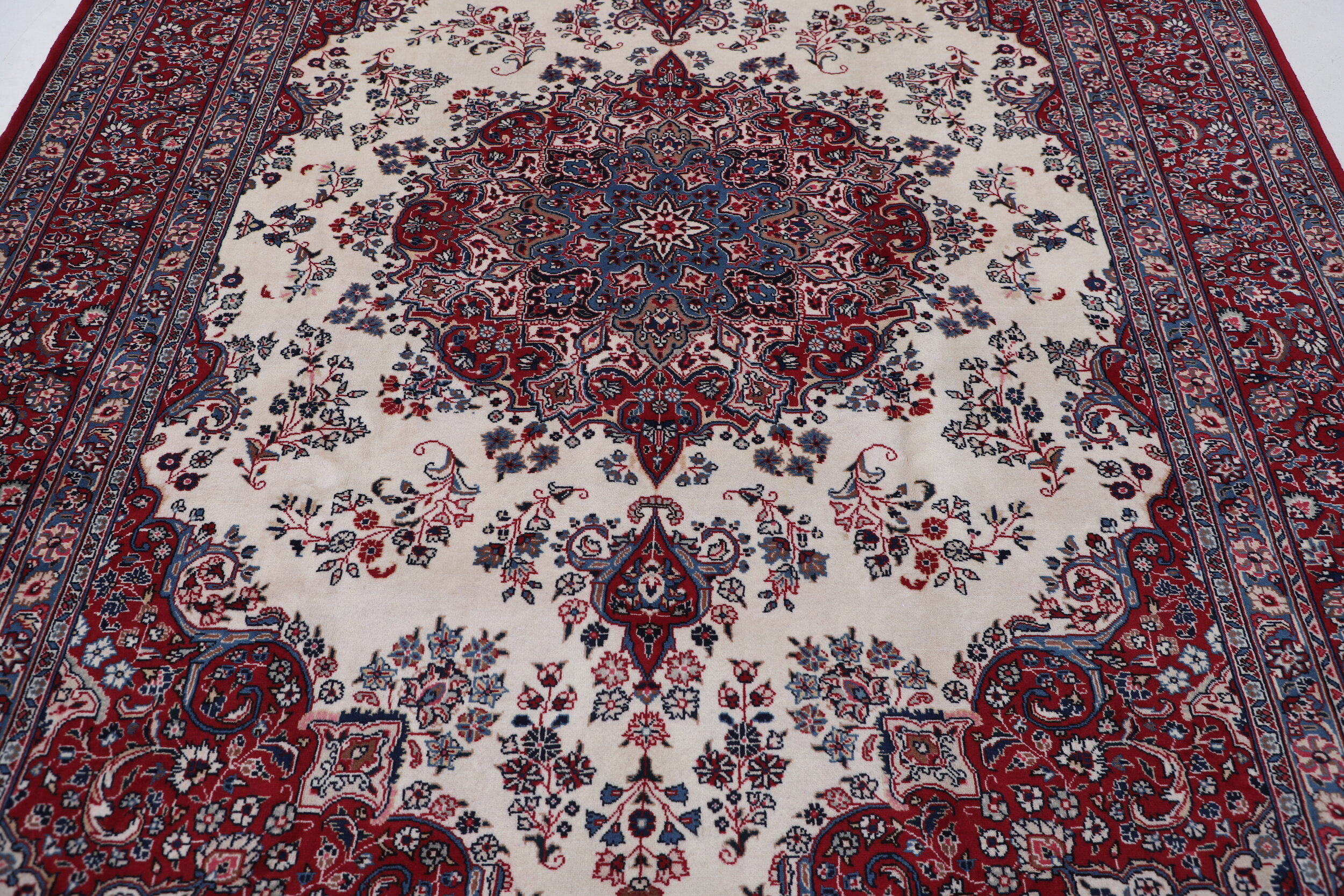 This Persian Rug is hand-knotted with Wool Pile and Cotton Foundation. This Rug has a Floral Design, and its Main colors are Beige, Blue, and Red.